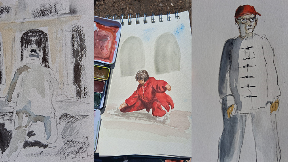 Se ve gente correteando por medio de la plaza, vestida con trajes coloridos, abotonados con nudos, terminando los preparativos del evento: El Día Internacional del Tai Chi.