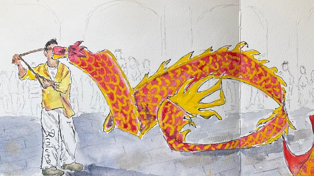 Además se ve a los mas jóvenes jugando con Dragones Chinos de cinta., unas marionetas que suben, bajan y se retuercen como una especie de cometa que serpentea en el aire, abanicos estallando como látigos, un látigo que parece detonar el aire, demostraciones de muñecos de madera, espadas que chocan contra palos, palos estrellándose contra el suelo, cuchillos mariposa y manos que surcaban el aire antes con ferocidad y que ahora se vuelven gráciles y sensibles.